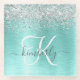 Teal Brushed Metal Silver Glitter Monogram Name Glass Coaster