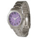 This women's watch has an art deco design that looks like likes on a circuit board. The lines are running vertically in teal on a field of purple. Want a different colour? Message me.