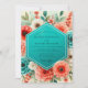 A vibrant display of coral, teal, and cream blooms creates a romantic and artistic atmosphere. Lush foliage intertwines with detailed floral elements, evoking a sense of natural enchantment. This design is perfect for a whimsical and richly coloured celebration.