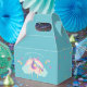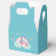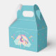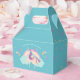 Personalised magical rainbow unicorn gable favor box in teal blue background. Girly, cute and fun.