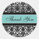 Wedding Thank You envelope seal stickers in elegant turquoise blue, black and white classic damask pattern, delicate and pretty.