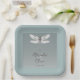 Personalise a simple and elegant paper plate for wedding reception guests with a set of Teal Dragonfly Wedding Paper Plates. Paper Plate design features a simple and elegant dragonfly with elegant script and modern typography for the bride and grooms' names and wedding date. Perfect for the couple having a dragonfly theme wedding. Additional wedding stationery and supply available with this design as well.