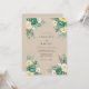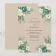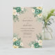 This design features a warm tan background adorned with lush teal and cream roses. Delicate sprigs of eucalyptus and leafy greenery accent the corners, creating an organic and romantic aesthetic. The watercolor textures and muted earth tones evoke a sophisticated vintage mood for a woodland ceremony.
