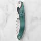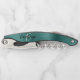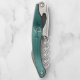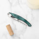 This distinctive personalised corkscrew features a modern teal blue brushed metal background. Customise it with their name in stylish black handwriting script over a white monogram initial.