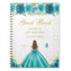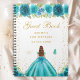 This elegant and glamourous birthday party guest book features a beautiful princess with brown red hair and fair skin in a teal blue ball gown. The text combines handwritten script and modern sans serif fonts for a classy and sophisticated look. The floral arrangements, butterflies and gold confetti create the perfect blend of rustic and chic.