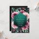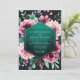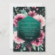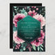 A dark, moody backdrop is adorned with lush floral arrangements in vibrant teal and deep magenta hues. Delicate blooms and foliage create an opulent, romantic atmosphere.