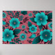 A vibrant floral pattern featuring large, teal-coloured flowers and lush green leaves arranged artistically on a rich maroon background. The design includes various leaf shapes and smaller flowers, adding depth and contrast to the overall composition. This design is ideal for use in textiles, wallpapers, or digital art projects seeking a balance of bold colours and natural elements.
