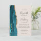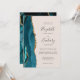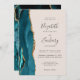 The left-hand edge of this elegant modern wedding invitation features a teal watercolor agate border trimmed with faux gold glitter. The customisable text combines charcoal grey handwriting, copperplate and italic fonts on a beige background. The reverse side features a matching teal and gold agate design.
