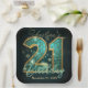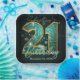 Celebrate a major milestone in style with this sophisticated 21st birthday paper plate. Perfect for a men's birthday or an elegant evening celebration, this modern theme features a bold "21" typography filled with a stunning teal and turquoise geometric agate mosaic pattern. The numbers are outlined in luxurious faux gold foil and set against a deep, dark background accented with festive sparkling bokeh lights. This stylish design bridges the gap between fun and maturity, making it an ideal choice for a guy's twenty-first birthday party. Easily update the script name and date to personalize it for the guest of honor.