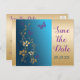 This teal blue and gold floral save the date postcard has metallic gold look flowers and purple butterflies on it that matches the wedding invitation shown below. If you require any other matching items in this design, please email your request to niteowlstudio@gmail.com.