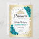 Quinceanera party invitation. Stylish design in teal and faux glitter gold. Features script font, roses, tiara and confetti. Perfect for a classy glam princess style 15th birthday celebration. Printed Zazzle invitations or instant download digital printable template.