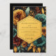 A dark, opulent backdrop showcases richly hued blooms in deep teal and warm golden tones. Lush foliage and delicate berry clusters add depth to this romantic, twilight-inspired botanical design. Evokes a sense of moody elegance for a special occasion.
