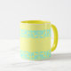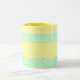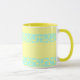 A mediaeval border of scrolling leaves and architectural elements in light teal blue on a creamy yellow background.