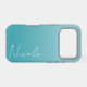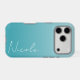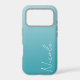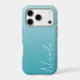 A custom personalised iPhone case in a modern soft teal blue gradient design. The trendy handwriting script font adds a unique touch when adding your name.