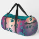 This colourful pattern duffel bag showcases a captivating teal and blue gradient background adorned with multiple shades of coloured paw prints. It's a stylish and versatile travel gear piece, ideal for any pet lover.