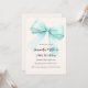 A soft beige, cream coloured background, decorated with a large teal, green coloured bow. Personalise and add a name and party details.