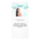 Birthday party menu card. Personalise and add a name, age, date and the menu. A white background and a large teal, green coloured bow.