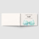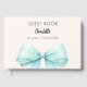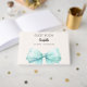 A beig, cream background colour. Decorated with a large teal, light green coloured bow. Personalise and add your name, age.