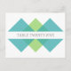 Modern and chic Geometric Triad Wedding Table Number Postcard featuring a stylish triangle design in turquoise and lime green. Easy to customise, this simple yet elegant design can be personalised by adding the appropriate table number(s) in the text field provided. Click "Customise It" to find more personalisation options.