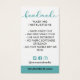 Washing instructions insert card for your small business of handmade goods. Handmade written in teal calligraphy at the top. Add washing instructions in black. Beneath teal social media icons, your social media handle. And your website at the bottom.