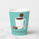 Holiday paper cups for a hot chocolate bomb party. These cups feature a smiling mug of hot cocoa with several hot chocolate bombs on a teal background. The words can be customised. Get these cups for your event.