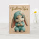 This beautifully gentle “Thinking of You” card features a cozy baby bunny in a teal knit bonnet and romper, holding a tiny bouquet of soft white blossoms. With warm tones and a tender expression, this card is perfect for offering comfort, sending love, or reminding someone they’re cherished and remembered. Soft, heartfelt, and irresistibly sweet.