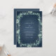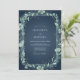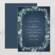 This design features a deep teal background adorned with a delicate, leafy botanical wreath. Subtle light green foliage and pale blue-green flowers create an elegant, naturalistic border, evoking a serene and romantic atmosphere for your special day. The artwork has a subtle, almost watercolor-like quality.