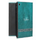 Personalised Teal Leather Celtic Knot Tribal iPad Mini Case. A faux leather folio cover in a rich teal blue green with a silver, stone and mint green Celtic shield knot, and silver Celtic chains. Fill in your name and initial at the prompt to personalise and customise anyway you like.