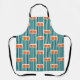 This apron has a mid-century modern design made of five teal lines and two orange rectangles repeated across the design.