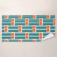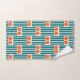 This towel set has a mid-century modern design made of five teal lines and two orange rectangles repeated across the design.