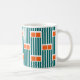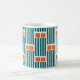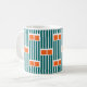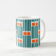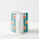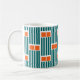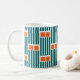 This mug has a mid-century modern design made of five teal lines and two orange rectangles repeated across the design.