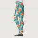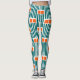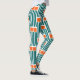 These leggings have a mid-century modern design made of five teal lines and two orange rectangles repeated across the design.
