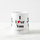 Light teal and black Love birds sakura cherry tree and blossom Coffee Mug. A personalised mug with the phrase "I Love You", with a red heart instead of the letter "o" and name perfect gift for Valentines day.