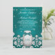A gorgeous and elegant greenish blue teal aqua turquoise hued firefly mason jar wedding invitation that looks like it glows. Add the initials and or monogram of the bride and groom to the jar with a printed ribbon look design. A subtle vintage damask antique lace border compliments this rustic yet elegant design with enchanting fireflies inside and outside of the jar. These invites are beautiful for a nighttime, barnyard, farmhouse or country themed wedding. Artwork © Chrissy H. Studios, LLC. All Rights Reserved.
