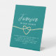 Elegant, simple teal memorial wedding memorial table pedestal sign with faux gold rope heart and modern calligraphy script.