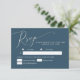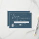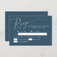Elegant and minimal wedding RSVP card featuring a modern script text at the top on a teal background. This simple design will work for any season. The card also includes meal choice options for guests to select from.
