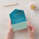 All in one wedding invitation in deep cyan and mint green with elegant fonts and the silhouettes of palm trees. Perfect all in one wedding invitation for beach weddings, destination weddings.