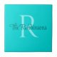 Beautiful personalised tile with teal colours, custom features include initial (monogram), and family name.