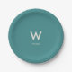 Trendy personal party paper plates featuring teal background, large centred monogram and associated name. Clean, simple minimalist typography. Fully personalizable.