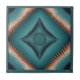 A symmetrical geometric pattern design in a square format with a teal and copper colour scheme. The centre features a large diamond-shaped medallion with intricate line work and a circular sunburst pattern inside. The medallion is surrounded by four smaller diamond-shaped frames with ornate border patterns. The background has a radiating sunburst effect emanating from the centre, creating a dynamic sense of movement. The outer border consists of jagged, sawtooth-like spikes in copper tones against the teal background. The entire design is enclosed by a thin dotted line border. The colour palette transitions from deep teal in the centre to lighter turquoise tones near the edges, with copper accents in the spikes and decorative elements. The pattern has a Native American or Southwestern design influence with its geometric shapes and radiating motifs.