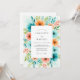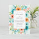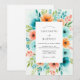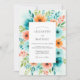 A vibrant watercolor floral arrangement bursts with teal, orange, and coral hues, surrounding a central area for event details. This lively design evokes a sense of joyful romance, perfect for a warm-weather celebration.