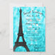 Modern Paris themed Sweet 16 birthday party invitations. Glamourous teal blue glitter lights background with an Eiffel tower. GRAPHICS by JW Illustrations © JESSICAWEIBLE.COM