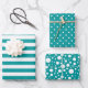 Three patterns in teal and white: basic stripes, polka dots and random spots.