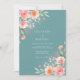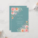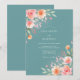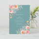 A delicate watercolor arrangement of peach and blush blossoms with soft green foliage adorns this teal background. The painterly style evokes a romantic and airy atmosphere, perfect for a whimsical yet elegant occasion.