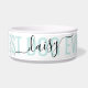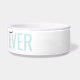 Teal aqua turquoise blue-green dog bowl with grey "BEST DOG EVER" and your dog's name customised in a chic and elegant calligraphy script font text overlay. Enter any personalised text you like for the background and top layer of text to create your own personalised modern and minimal and fun ceramic pet food or water bowl. See our collection of coordinating bowls and get a set!