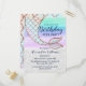 This girly and cute Birthday Party invitation is the perfect choice for a fun and exciting Pool Party for the birthday girl and her friends. The design features a pretty and majestic hand-drawn illustrated mermaid tail on top of a teal pink watercolor white glitter background. The tail is clipped with an orange, teal blue, green, purple, and pink gradient ombre outlined faux printed rose gold foil. This artsy, trendy, and adorable design will be sure to make your daughter and her guests smile.