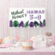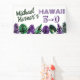 Vibrant green and plum purple birthday banner is a bold way to say happy Hawaii 5-0. Vibrant monstera leaves and ferns are colourful for a festive 50th birthday party. Tropical teal green and dark purple leaves are versatile for a variety of coastal themed celebrations.