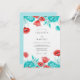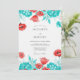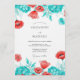 A vibrant botanical design features bright coral poppies and lush teal hydrangea blossoms scattered across a crisp white background. Touches of verdant foliage weave through the floral arrangement, creating a lively and romantic aesthetic. This artwork evokes a sense of fresh, artistic charm.