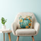 Add this autumn themed throw pillow to your fall decor. It features a bohemian style image of a teal coloured pumpkin with leaf and flower accents on ecru background.