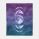 A bohemian celestial fleece blanket with a teal blue and purple lunar moon phases on a starry sky.